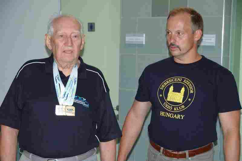 A Debreceni Szenior Úszó Klub hat fős csapattal vett részt a szlovéniai Kranjban augusztus 28 – szeptember 2. között megrendezett XI. Szenior Úszó Európa-bajnokságon. 32 ország 3800 versenyzője nevezett a versenyre. Az első világversenyén szereplő 86 éves Puskás Pál négy egyéni versenyszámban indult, és valamennyiben győzött! Legjobban a 100 méteres gyorsúszásban kellett megküzdenie a győzelemért Pali bácsinak, de itt is közel 5 mp-es különbséggel előzte meg lengyel ellenfelét. A „mesternégyes” nem előzmények nélkül született: Puskás Pál az 1930-as, 40-es években aktív úszóversenyző volt, majd a 70-es évektől a gyulai szenior országos bajnokság győztesei között találkozhatunk a nevével. Több éves kihagyás, betegség, majd sikeres szívműtét után kezdte újra az úszást és a szenior versenyzést az időközben megalakult Debreceni Szenior Úszó Klub színeiben. Számos hazai és külföldi versenyre eljutott, és gyorsúszásban évek óta nem talált legyőzőre. Előző korcsoportjában négy, a jelenlegiben mind a hat gyorsúszó versenyszámban ő tartja az országos csúcsot 50 m-től 1500 méterig, sőt a nem hivatalos 1200 m-es és 2000 m-es táv országos ranglistáját is ő vezeti. A tavalyi szenior világbajnokság kategória győztes eredményeinél Puskás Pál négy gyorsúszó távon jobb időeredményeket ért el a hazai és külföldi versenyeken, így jó eséllyel nevezett az idei Európa-bajnokságra. Az előzetesen nyilvánosságra hozott rajtlisták tovább erősítették várakozásainkat. Pali bácsi unokája, Puskás Levente társaságában utazott a versenyre. A lelátón lévő nagy tömeget, az esős időjárást, a hosszú, több órás várakozásokat, a zsúfolt melegítési lehetőségeket jól viselte az idős debreceni versenyző. Fegyelmezett, okos versenyzéssel valamennyi versenyszámában sikerült győznie. A közel 200 fős magyar küldöttség tagjain kívül számos külföldi sporttársa gratulációját fogadta Pali bácsi.