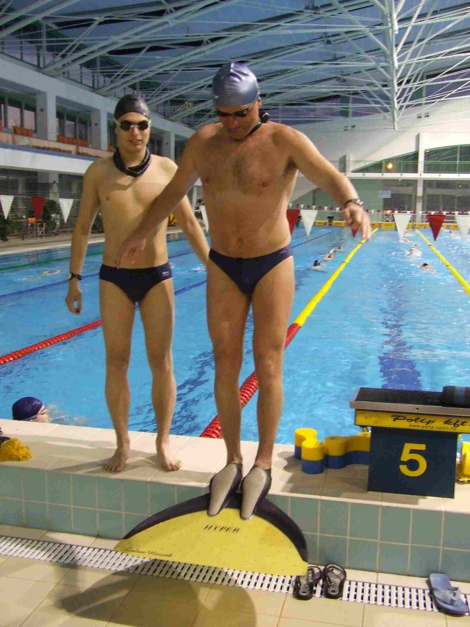 AIDA Individual World Championship, Maribor 04-07 July, 2007 A versenyt idén Szlovéniában, a maribori sportuszodában rendezik. Minthogy uszodai vb-ről van szó, a három uszodai számban lehet kvalifikálni. 1. DNF (dinamic with no fins) - azaz ki jut messzebb a víz alatt egy levegővel uszony nélkül 2. DYF (dinamic with fins) - ugyanez a cél csak uszonnyal 3. STA (static) - statikus, vagyis ki tudja tovább visszatartani a levegőt a víz felszínén mozdulatlanul lebegve (természetesen arccal lefelé) Minden országból számonként és nemenként négy versenyző indulhat. A Magyarországon működő apneások közül kettő Debrecenben edző (Horváth Zoltán és Fizil Ádám) is indul a bajnokságon. Zooo a statikus számban, célja, hogy hét perc (!) fölé kerüljön és lehetőleg ezzel döntőbe is jusson. Jómagam (Ádám) a két dinamikus számban (DYF, DNF) indulok. Uszony nékül 125 méter teljesítése a célom, uszonnyal pedig 150 m fölé kerülni. Az uszony nélküli számban reménykedem a döntőbe jutásban. A verseny elbírálása az AIDA nevű szövetség szabályai szerint zajlik. A nevezésnél meg kell adni egy teljesítményt (pl. dnf76m), ez olyan, mint úszásnál a nevezési idő. Ennek csak akkor van jelentősége, ha valaki a saját nevezésén alul teljesít (büntetőpont jár érte), vagy ha két azonos eredmény születik; ilyankor a magasabb nevezés jut előrébb a ranglistán. Büntetés jár a következőkért: - felszínen úszás - késői rajt (az indulásra megadott 10 másodperc után indul a versenyző) - szabálytalan forduló (nem érinti kézzel is a falat a versenyző vagy a víz alatt a párkány szintje alatt fordul) - szabálytalan lépés a surface protokollnál (Ez egy művelet amit a versenyszám után azonnal végre kell hajtani. A lényege, hogy a maszk és egyéb kellékek megfelelő sorrendben való levétele után, értelmes tekintettel ennyit kell mondani érthetően: "I'm OK!" - közben egyezményes kézjelzést adni. Ez oxigénhiányos állapotban olykor nem is olyan egyszerű ...) A büntetés itt többnyire kizárás, hiszen a célja ennek a procedúrának, hogy a versenyzők ne félholtan kerüljenek a felszínre, hanem még saját határaikon belül, viszonylag tiszta fejjel. - eszméletvesztés (ilyen is előfordul), természetesen ezért is kizárás jár. Mariborba 3.-án utazunk, este még uszoda-szoktató edzésre számítunk. Az ersdményekről természetesen értesítjük az edzéseinken felvigyázókat; a felettünk száguldozó DSZUK tagjait.
