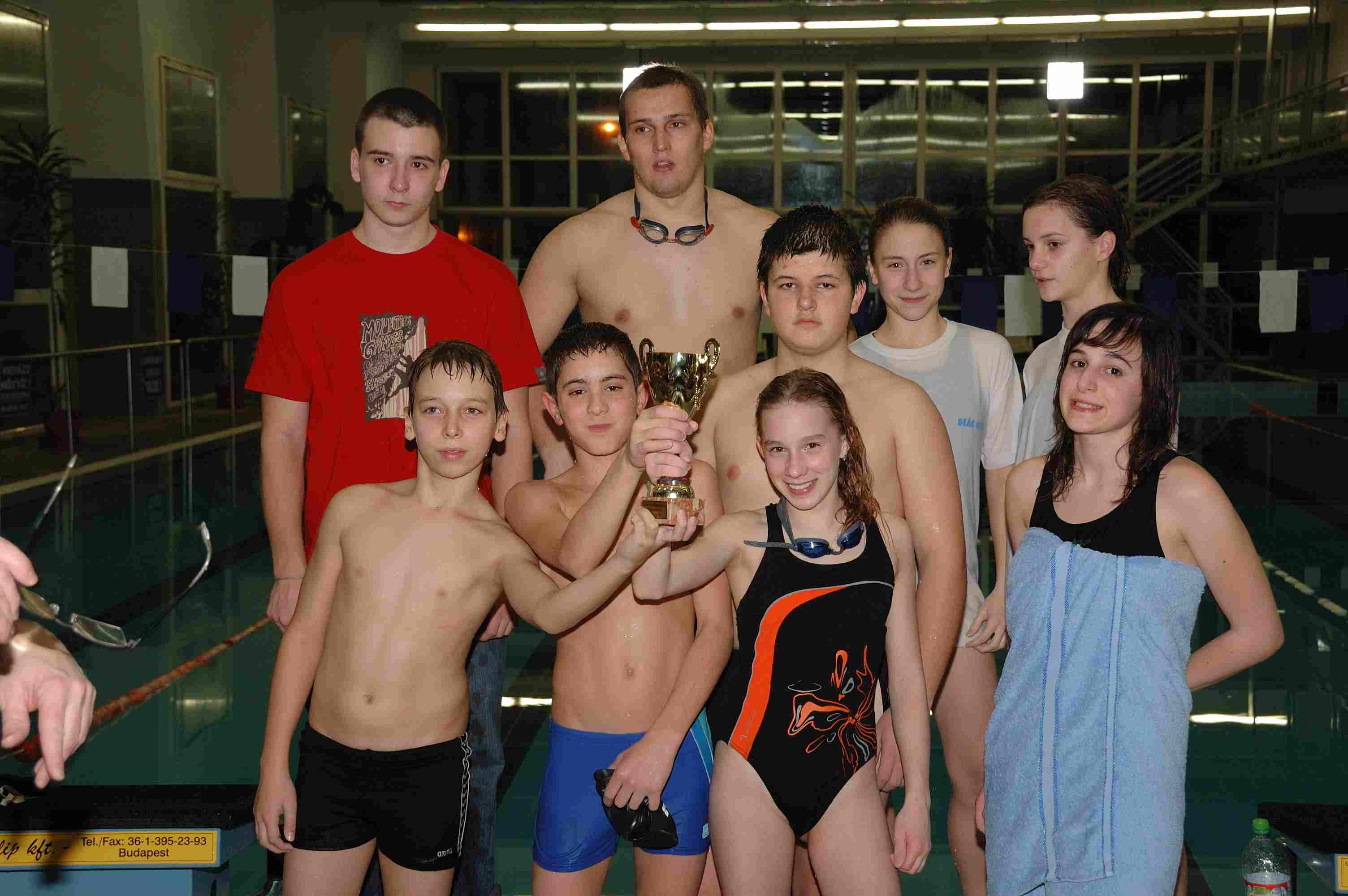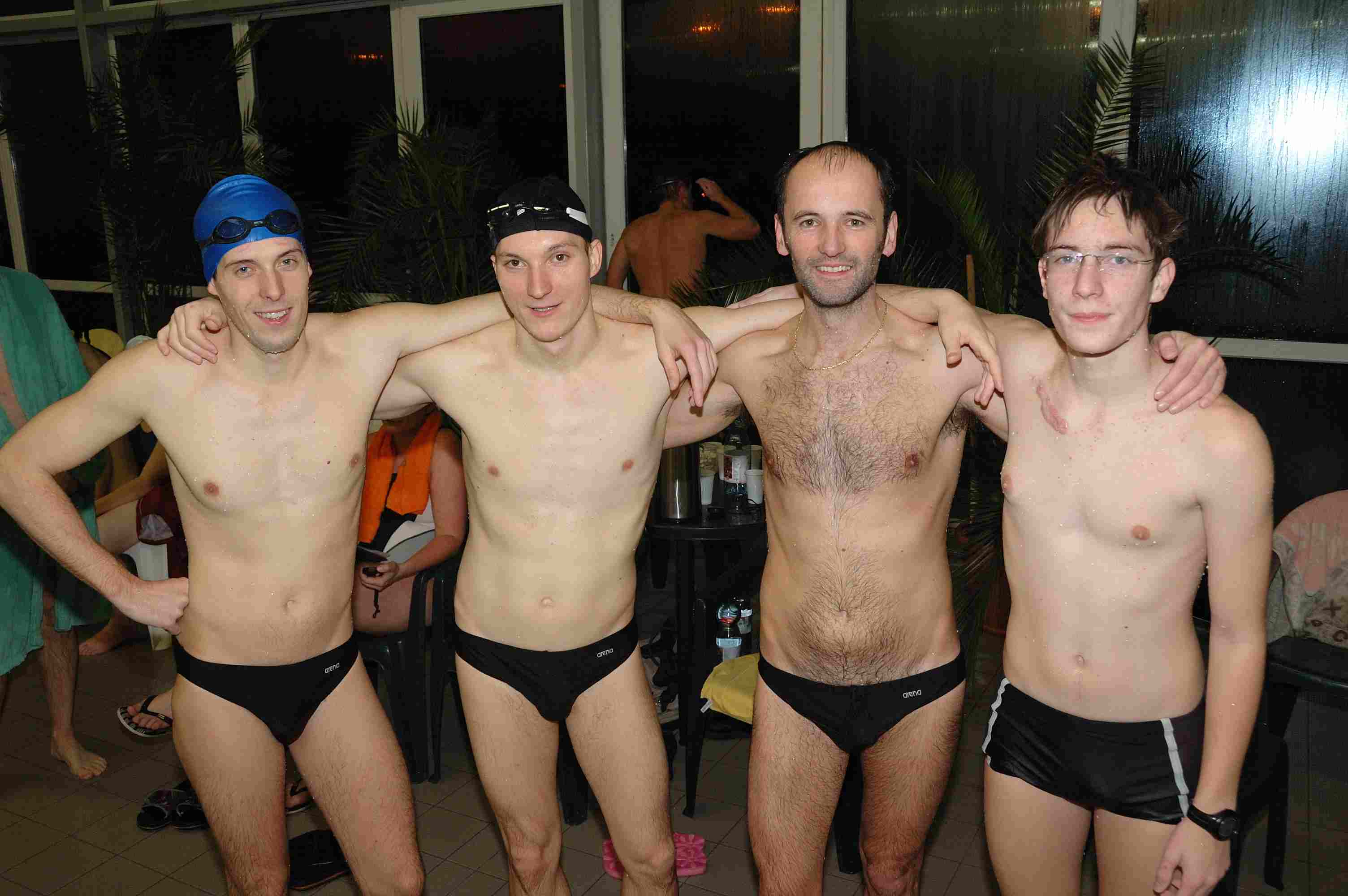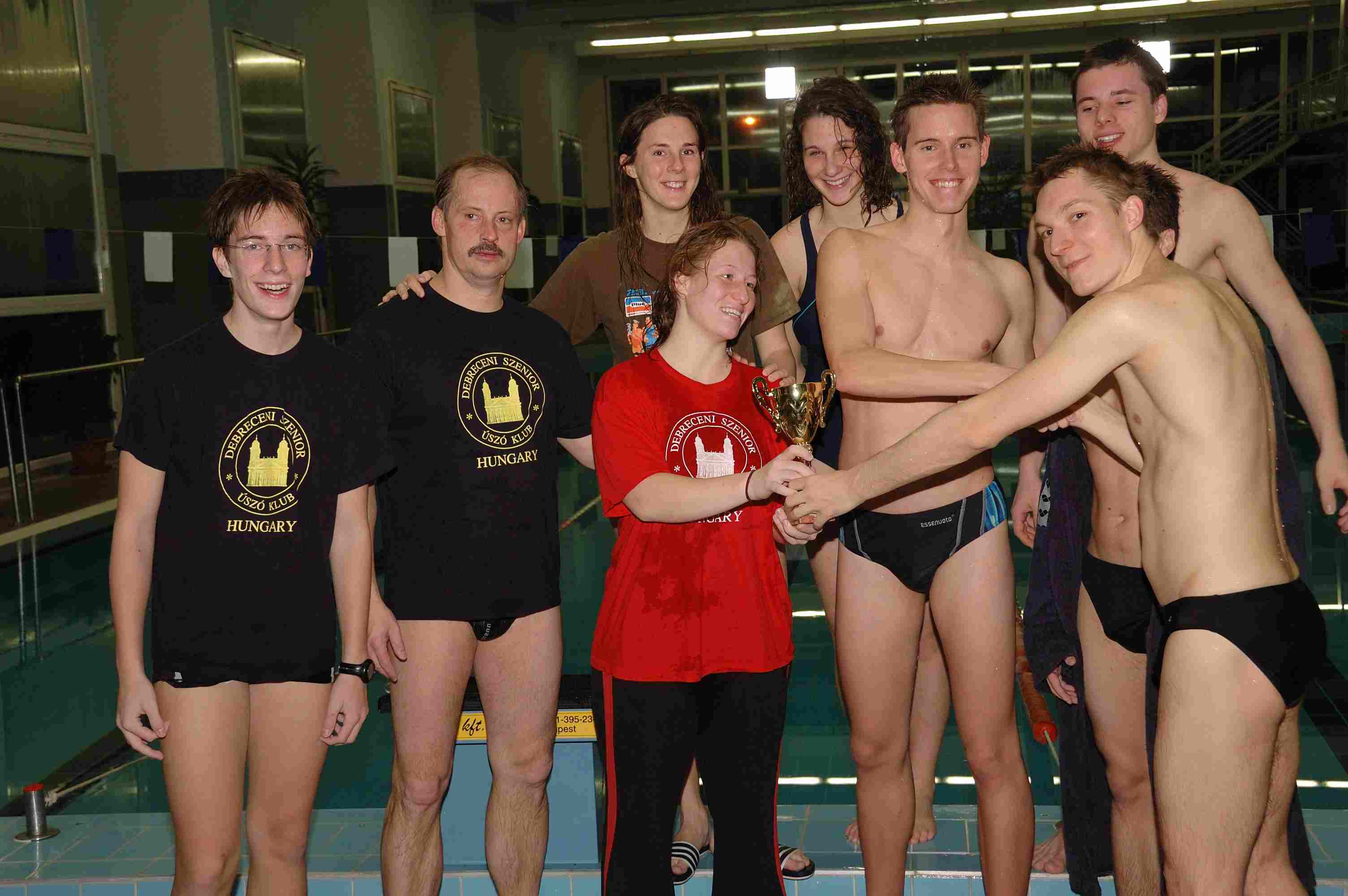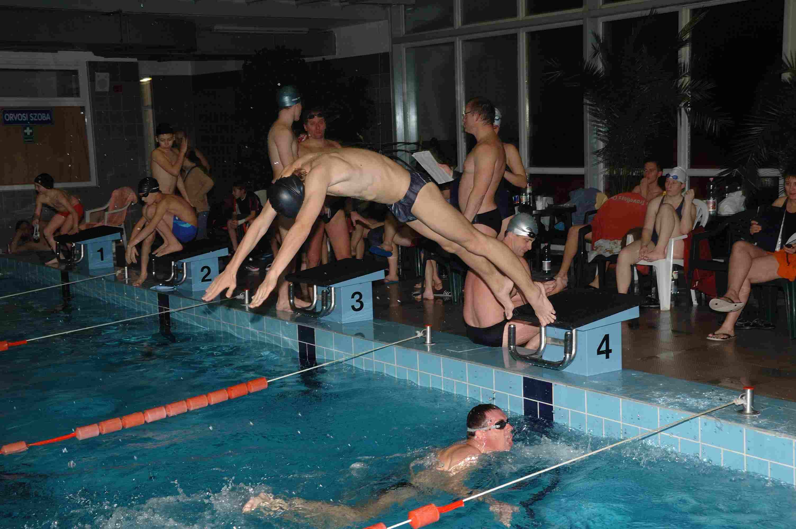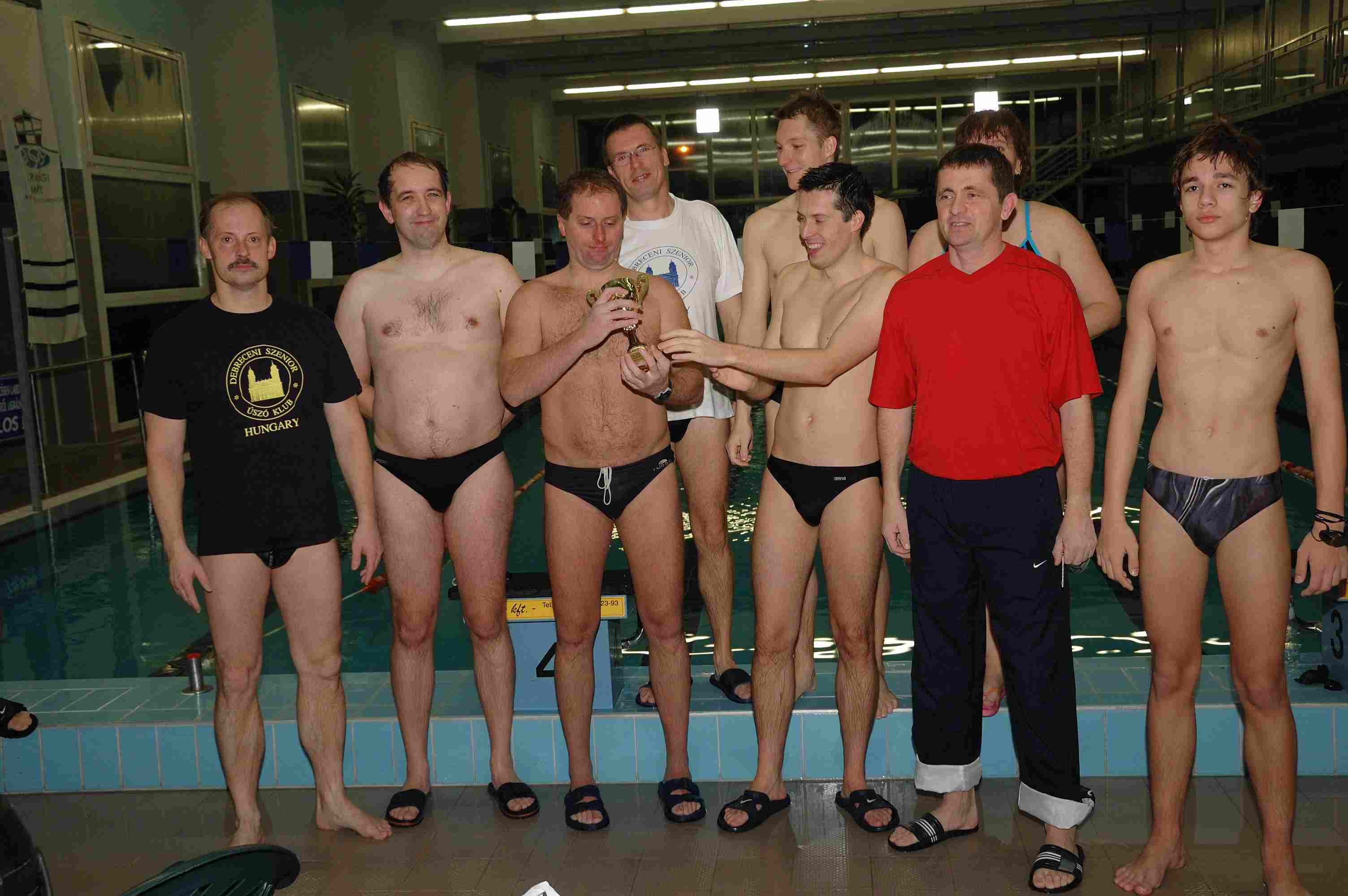 4 órás váltóúszás Nyíradonyban Az öt éve átadott nyíradonyi Harangi Imre Rendezvénycsarnok uszodájában negyedik alkalommal rendeztek 4 órás váltóúszást a nyíradonyi úszók, a debreceni szeniorok és a debreceni egyetemisták összesen öt csapat részvételével. A rajt pénteken 20 órakor volt, a befejezés éjfélkor! Váltani 100 méterenként lehetett, a 7 – 14 fős csapatok tagjai 9 – 27 alkalommal is sorra kerültek. Kiegyenlített versenyt vívtak a szenior úszók és az egyetemisták (a 18 km feletti össztávoknál a 132 m-es különbség 1% alatti!), és a többi csapatnál sem volt hiány páros versenyekből és főleg a gyerekeknél a hangos biztatásból. Az eredmények: Debreceni Szenior Úszó Klub 181x100 m + 40m Csapattagok: Horváth Zoltán, Salamon Tibor, Krucsó Zsolt transzplantált versenyző, Dr. Kádasi Tibor, Godó Soma, Nagy Emese, Dr. Kerekes Sándor, Szabó Attila, Vas András. Debreceni Egyetem 180x100 m + 8 m Csapattagok: Lukács Linda, Szabó Pálma, Herman Anita, Godó Bence, Dr. Rentka László, Fizil Ádám, Tanyi Attila. Nyíradonyi VVTK úszószakosztálya 155x100 m Csapattagok: Tasi Gergő, Makuta Péter, Kurtyán János, Szilágyi Kristóf, Tóth Gábor, Csorba Krisztina, Perge Liza, Szilágyi Zsuzsa, Deák Gréta. Debreceni vegyes csapat 137x100 m + 48 m Csapattagok: Kiss Attila, Szabó Benjámin, Birócsák Péter, Kovács Attila, Nagy Zoltán, Dobó Sándorné Kati, Bihari Árpád. Nyíradonyi vegyes csapat 128x100 m + 50 m Csapattagok: Móricz Sándor, Teremi László, Czene Tibor, Csepregi Benjámin, Szilágyi Viktória, Puskás Ágota, Szilágyi Levente, Veres Gábor, Fekete Zsoltné, Zombori Emese, Badacsonyi Attila, Győri István, Kiss István, Rácz Tibor. A képek a verseny alatt és a díjátadáskor, éjfél után készültek a résztvevőkről (Vas András szenior úszó jegyzi őket).