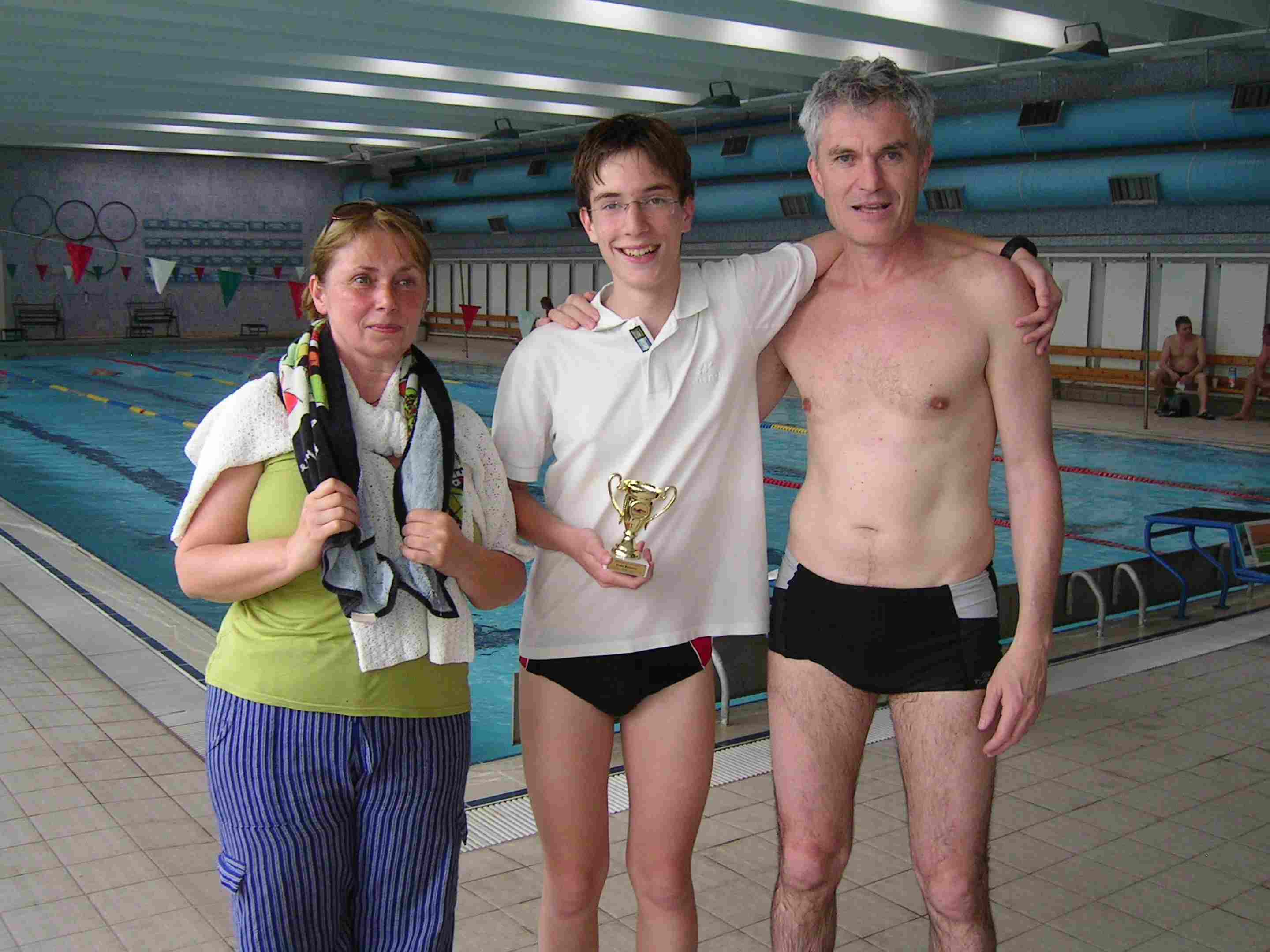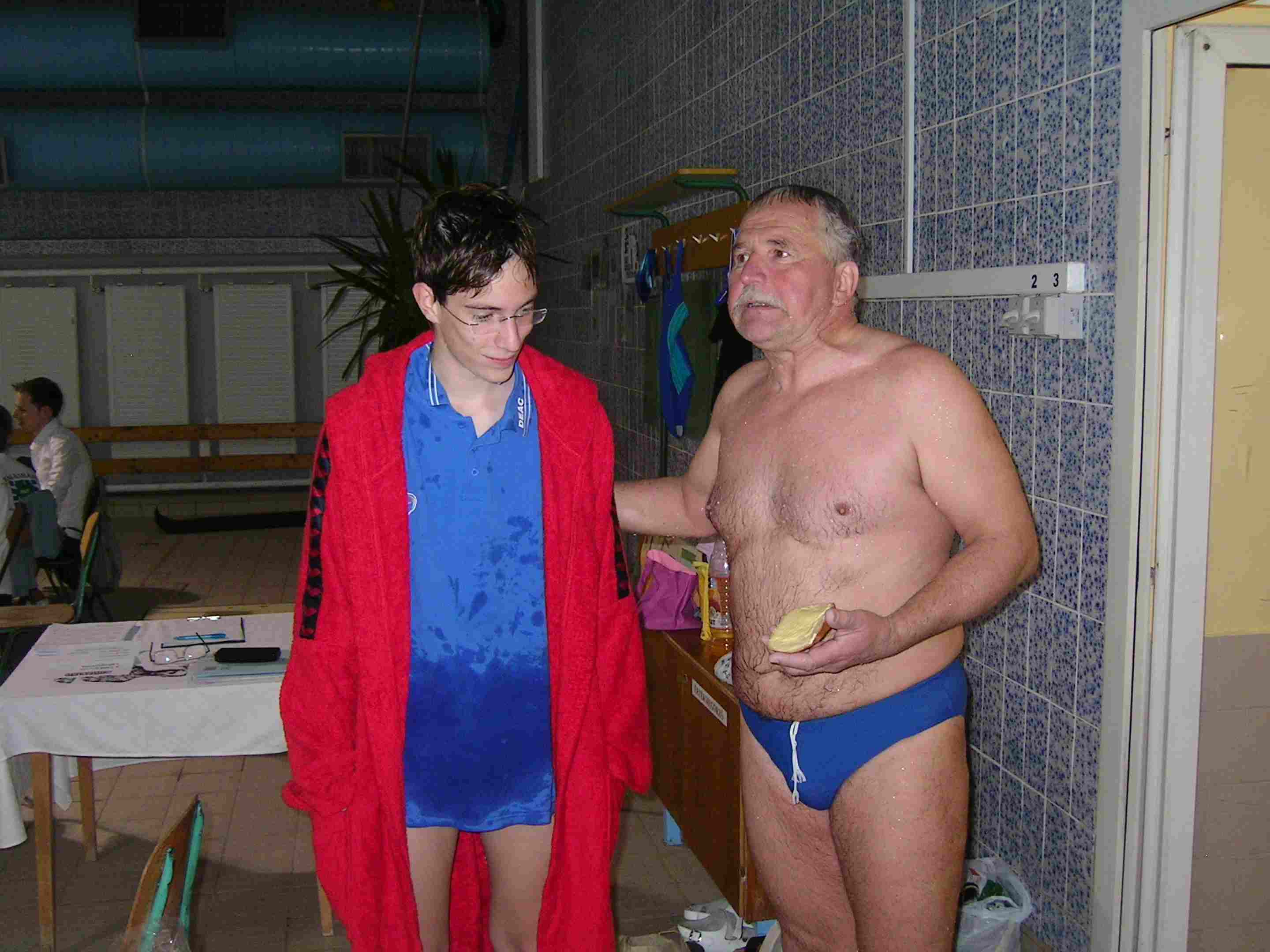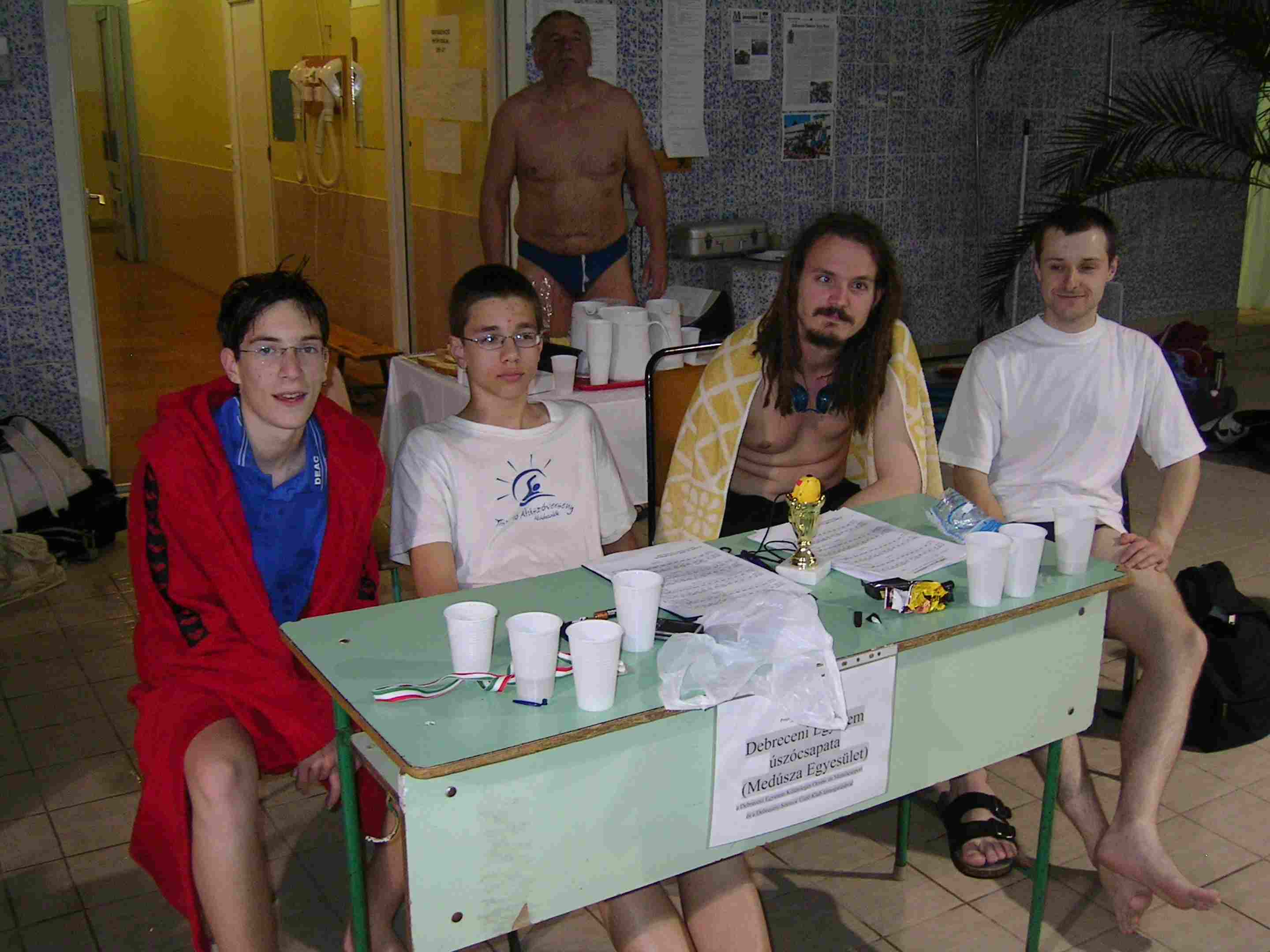 2008. 03. 17-18 33 órás váltóúszás Először hadd írjam le, hogy mi úton csöppentem bele a Debreceni Szenior Úszók illetve a Medúsza egyesület társaságába. Volt egy diákolimpia természetesen úszás. Az Újonnan épült uszodában volt megrendezve. Mivel már akkor is szerettem úszni jelentkeztem. Voltak dolgok, amik nélkül nem mehettem: fejesugrás stb. Édesanyám ill. Édesapám révén jutottam el Dr. Rentka László-hoz. Aki ma már a mentorom is egyben. Megtanított fejest ugrani, amit egyébként ma is nagyívben kerülök. Az „olimpián” 4. lettem 100 m gyorson. Laci bácsi érdeklődött e-mail útján, hogy milyen helyezést értem el. Azt is megírta, hogy vár a csapatba. Nos így kerültem be ebbe a légkörbe. A Verseny előtt nagyon izgatott voltam, hogy milyen lesz, nem fogok e unatkozni. Amint megérkeztem a helyszínre megnyugodtam. Már rögtön leesett az állam, amikor megláttam a táblát : „12 km” „x csapat”. Mondom rossz helyre jöttem. De közben leesett. Én a Medúsza Egyesület-be tartozom. Láttam, ahogy bemegy illetve, ahogy kijön a vízből Fodor György-öt. Sok új barátot szereztem. A Verseny csúcspontja az volt, amikor megkaptam a névre szóló különdíjat. Nagyon örülök neki. Volt viszont egy személy (direkt nem írom le), akivel akadt egy kis galiba, így elment. Szerintem aki ott volt, az tudja kiről van szó. Én összesen 7x úsztam. Nagyon élveztem. Az egész verseny alatt szinte ott voltam. Kivéve azt a maradék 3 órát, amikor hazamentem. Nagyon köszönöm ezt az élményt mindenkinek. Köztük: Dr. Rentka László Dr. Kappelmayer János Salamon Tibor Kiss Attila Szabó Attila Godó Soma Gyepesi István-->Nagyon finom volt a sajt. Fizil Ádám--> Sok sikert a vizsgákhoz. És persze: Hajós Alfrédnak Ha esetleg valakit kihagytam az nem dirket volt, de összefoglaló néven Köszönöm A Debreceni Szenior Úszóklubnak és a Medúszának. Szabó Benjámin