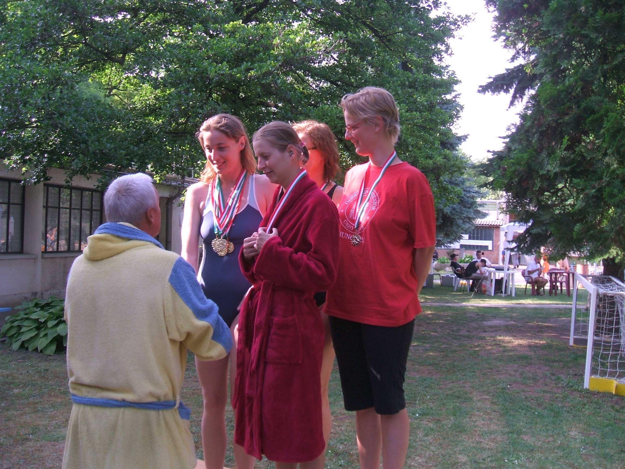 A debreceni csapat egyetlen női váltója a fenti tervezett összeállításban szállt volna vízbe, de a sors másként rendezte és Petra végzős orvostanhallgatóhoz méltó módon a segítségére sietett egy úszótársunknak aki az előnyári melegben rosszul lett. Ezért a váltó egy másik összeállításban, az új debreceni csapattaggal bővítve úszott. A váltóban (a rendezők engedélyével) úszott a vendégversenyző Hoffmann Ági, akit a hódmezővásárhelyi és békéscsabai versenyekről ismerhettek. Ági több egyéni számban is indult és töretlenül javít az időeredményein. Neki ez volt az első váltó versenye és ezért izgulhatott. Azt nem tudom, hogy izgult-e vagy sem, de az úszásán nem látszott az izgalom!