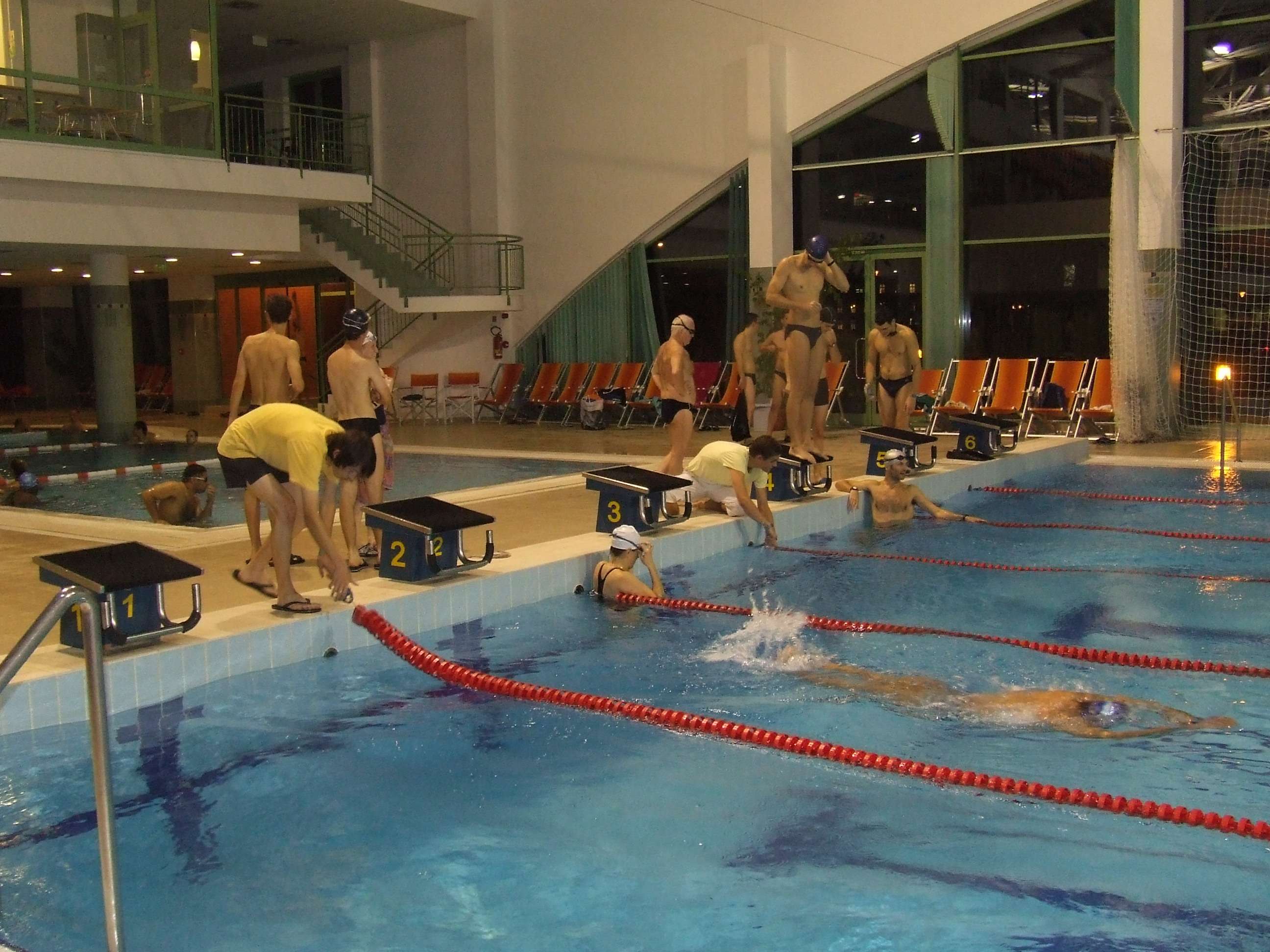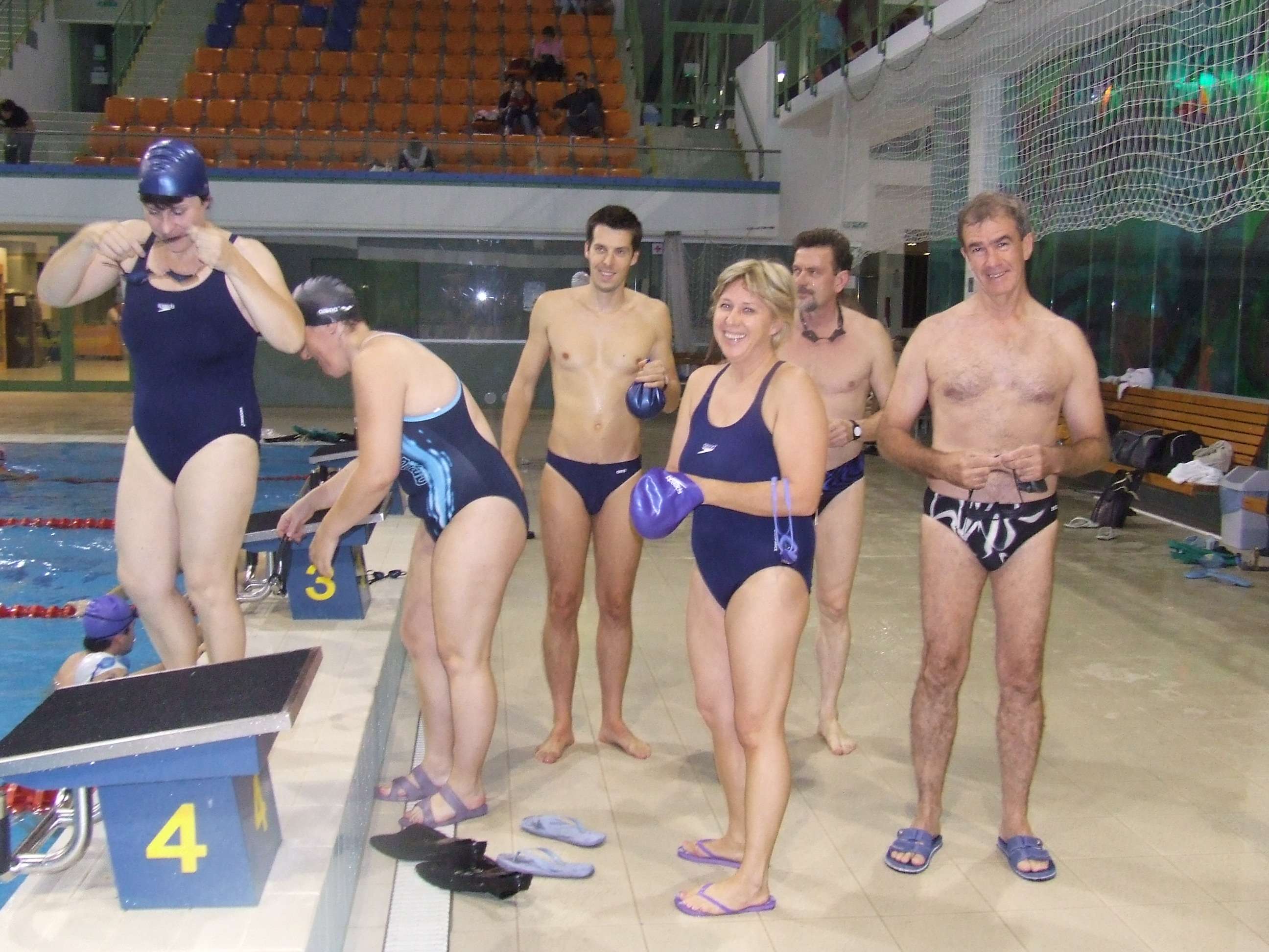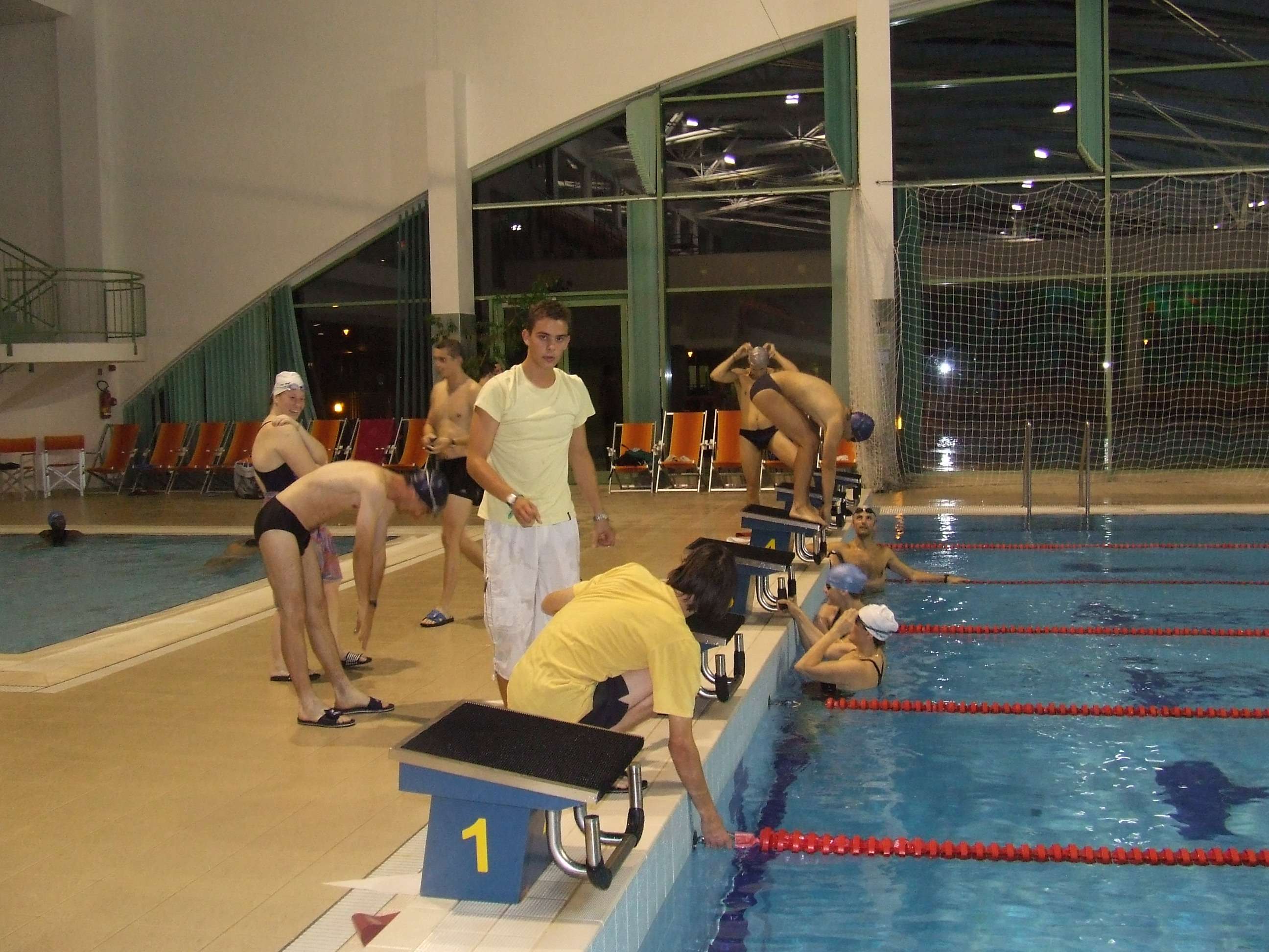 Szeptember 7-étől elkezdtük egymillió forintos vízfelületi támogatásunk elköltését (Debrecen Megyei Jogú Város Önkormányzata tavaly és idén is ennyi támogatásban részesítette egyesületünket, amelyet a Debreceni Sportuszodában pályabérlésre fordíthatunk). Hétfőn, szerdán és pénteken 19 órától tudtunk pályát bérelni, és meglepve tapasztaltuk, hogy a szomszédos pályákon jóval több a bérlőtárs, mint eddig: szerdánként például a 10 pályából 9-en folyt edzésmunka, és Debrecen város úszni vágyó 19-20 óra között egyetlen pályára szorultak. Mivel "oldalra" már nem terjeszkedhettünk, bevezettük a 20 óra körül kezdő második turnus bevezetését, amelyet főleg az egyetemistáknak és az "egészségükért úszó" csapattársaimnak ajánlottam. Három hétig tartott ez a beosztás. Október 2-án, pénteken újabb korszak kezdődött a Debreceni Sportuszodában: az 50 m-es medencében 20 órától zárásig valamennyi hétköznapon a Debreceni Vízilbda Egyesület tart edzést, a kapu mögötti területen olykor a Debreceni Harcsákkal osztozva a medencén. Néhány nappal korábban üzenetet kaptunk (szóban, telefonon és e-mailben), hogy 20 órától a 25 m-es medencében fejezzük be edzésünket (19 órától másfél órás bérlésünk volt eddig is). Ez tulajdonképpen kapóra jött nekünk, hiszen edzésünk gyosító részét praktikusabb 25 m-es pályán végezni, valamint 20 óra körül csapatunk többsége befejezi edzését és a melegvízben folytatja az estét, tehát a 25 m-es medencében két pályán elég jól boldogulunk. A 20 órakor kezdő későbbi csoport is beletörődött a megváltozott helyszínbe.(Az úszók már csak olyanok, hogy ott úsznak, ahol lehet...) Az október 7-ei, szerdai edzésen készítettem a mellékelt fotókat, és a heti edzésprogramot és az edzéseken született néhány időeredményt is elérhetővé tettem. Az edzést - kivételesen - egész héten a partról vezettem. Dr. Rentka László