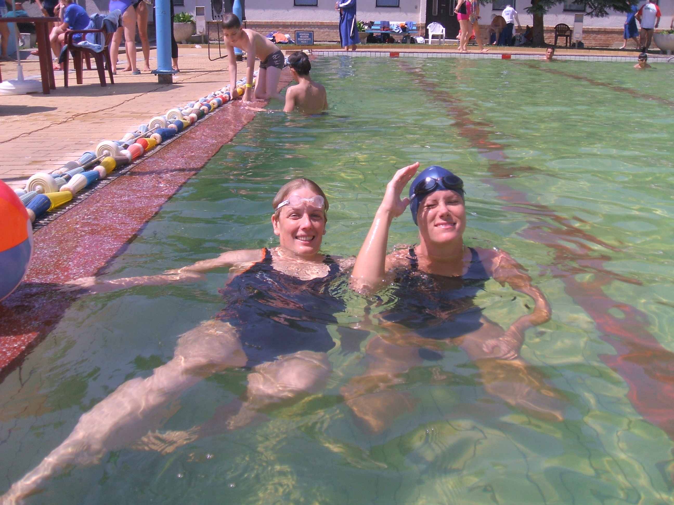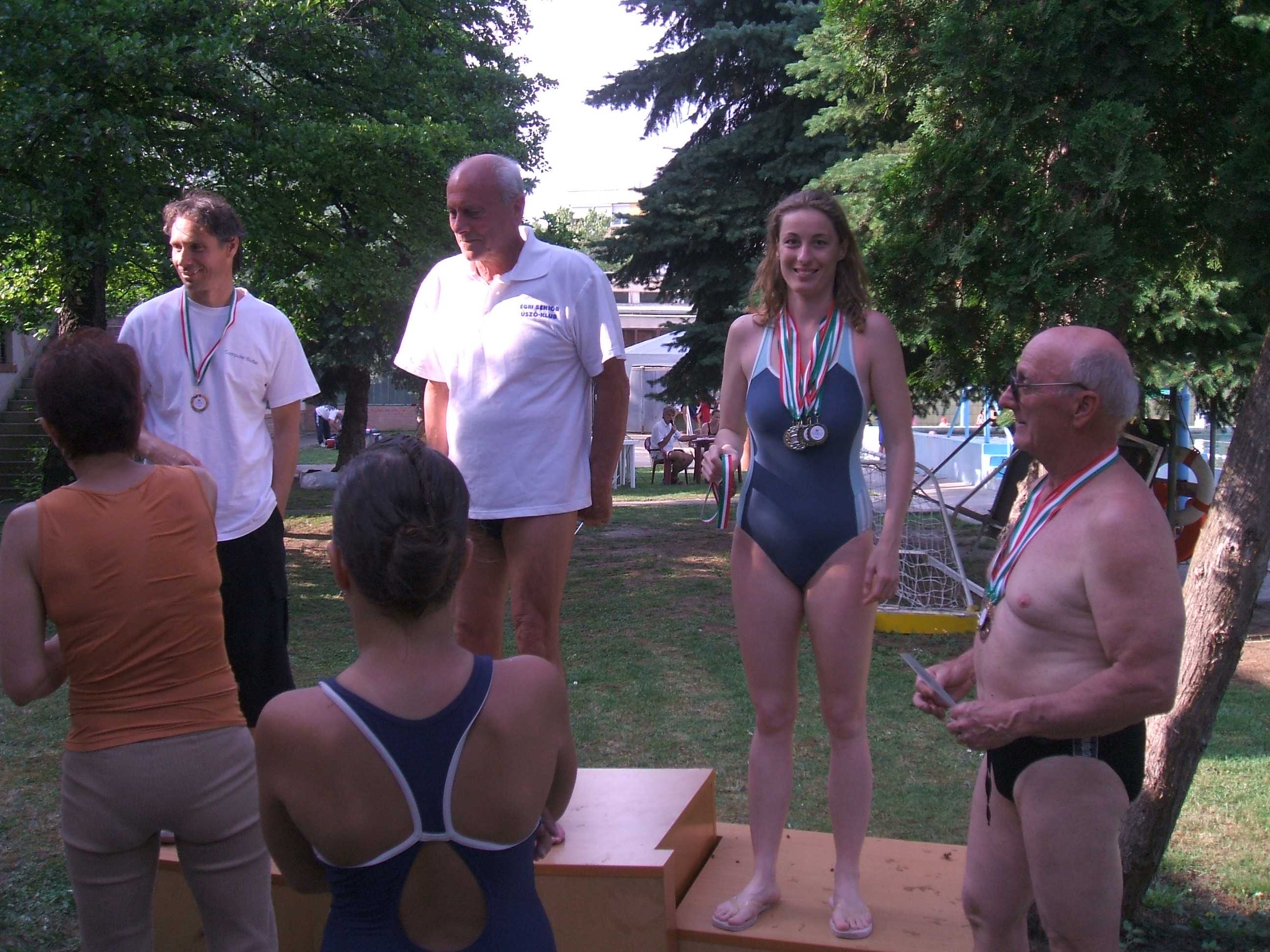 A debreceni csapat egyetlen női váltója a fenti tervezett összeállításban szállt volna vízbe, de a sors másként rendezte és Petra végzős orvostanhallgatóhoz méltó módon a segítségére sietett egy úszótársunknak aki az előnyári melegben rosszul lett. Ezért a váltó egy másik összeállításban, az új debreceni csapattaggal bővítve úszott. A váltóban (a rendezők engedélyével) úszott a vendégversenyző Hoffmann Ági, akit a hódmezővásárhelyi és békéscsabai versenyekről ismerhettek. Ági több egyéni számban is indult és töretlenül javít az időeredményein. Neki ez volt az első váltó versenye és ezért izgulhatott. Azt nem tudom, hogy izgult-e vagy sem, de az úszásán nem látszott az izgalom!