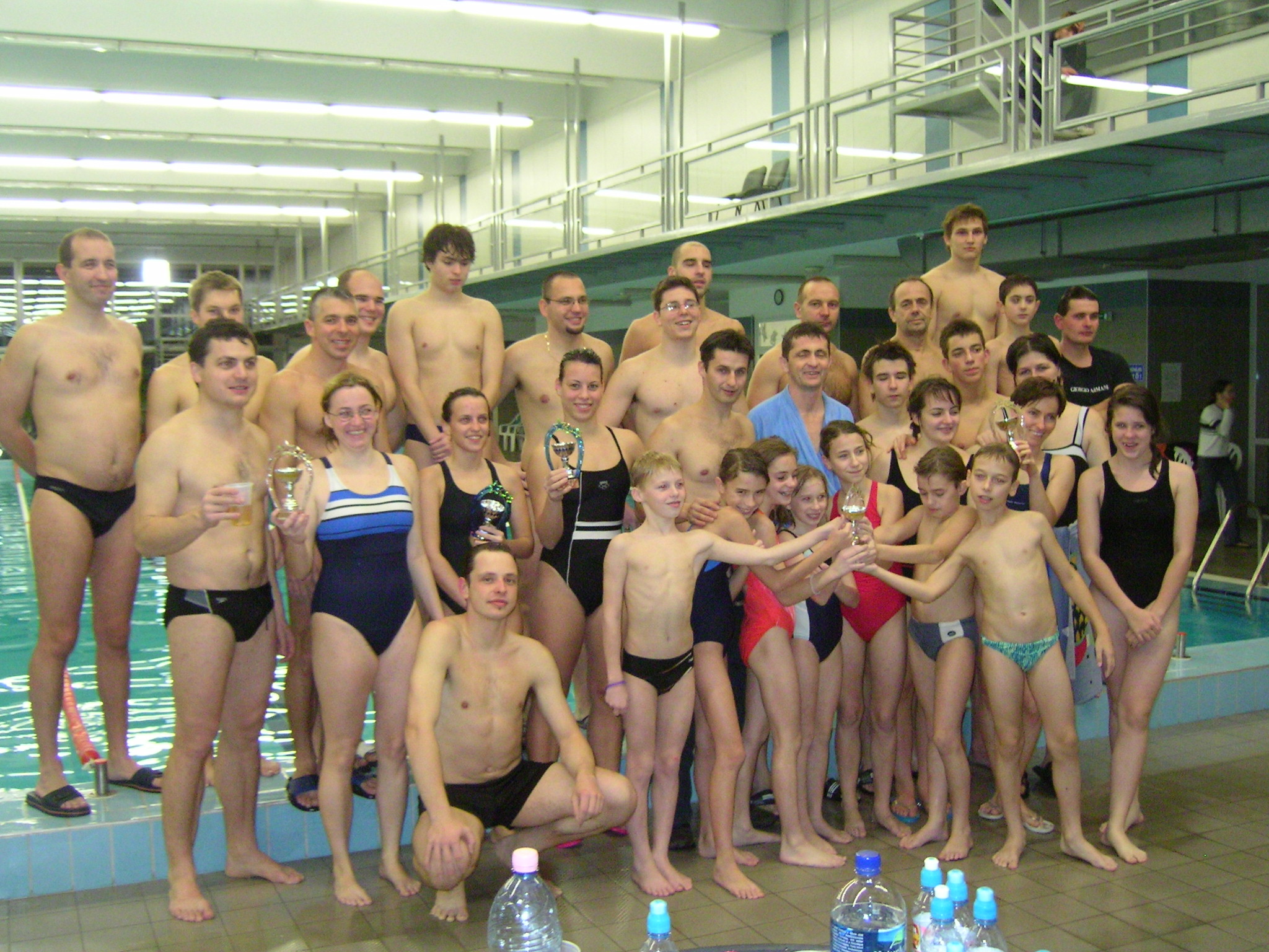 Ha december, akkor 4 órás váltóúszás Nyíradonyban, a Harangi Imre Rendezvénycsarnok öt pályás, 25 méteres uszodájában! Az első alkalommal, tavaly a Debreceni Szenior Úszó Klub, a debreceni egyetemisták MEDÚSZA Egyesülete, a DEDUSZ SE (a debreceni úszók) és a nyíradonyi Rendezvénycsarnok által kiállított négy csapat úszott. 2006. december 8-án, a második alkalommal megrendezett 4 órás úszáson pénteken este 8 órától éjfélig 100 méterenként váltották egymást a csapattagok. Mind az öt pályára jutott egy-egy váltó. Örömteli volt látni, hogy a nyíradonyiak idén két váltót is indítottak. A Nyíradony Városi Verseny és Tömegsport Klub 9-11 éves úszópalántáin kívül, akik nyolcan (Parai Gergő, Szilágyi Kristóf, Veres Tamás, Tar Zsófia, Csorba Krisztina, Perge Liza, Tóth Gábor, Deák Gréta összeállításban) 136x100 m-t + 75 m-t úsztak, a helybeli idősebb úszókból, szülőkből, sőt a Rendezvénycsarnok fitt munkatársaiból verbuválódott 14 fős másik váltójuk tagjai a fiatalok melletti pályán rótták a hosszakat, nagy küzdelemre és buzdításra késztetve a kicsiket. A 134x100 m-t + 47 m-t úszó váltó tagjai: Szilágyi Zsuzsa, Kurtyán Miklós, Ratkó József, Móricz Sándor, Lázár Mariann, Molnár Csilla, Fekete Zsoltné, Tasi Gergő, Makuta Péter, Szilágyiné Tünde, Kiss István, Csepregi A., Csorba T. és Bedő Tamás. Idén a debreceni Szeniorok és a debreceni egyetemisták összecsapása az egyetemisták bő 340 méteres győzelmével zárult. Az országos egyetemi úszóbajnokság óta egyre gyarapodó egyetemi csapat erejét bizonyítja, hogy tavalyi teljesítményüket több, mint 1300 méterrel meghaladták, és egy-egy 100 m vegyest, sőt pillangót is beiktattak (utóbbit 1:16-os idővel Galgóczi Krisztina, az idei MEFOB ezüstérmese, a Rövidpályás Országos Bajnokság résztvevője úszta. Érdekességképpen: a gyulai úszólány, aki Debrecenben első éves pszichológia szakos hallgató, az említett két versenyen 1:09,31 mp és 1:05,42 mp alatt úszta a 100 m pillangót…). Fizil Ádám, Fodor György, Dr. Fábián Ákos, Rácz Kálmán és Dr. Benyó Mátyás úsztak még (összesen 18 687,5 m-t) a győztes egyetemi csapatban. A Debreceni Szenior Úszó Klub nyolc fős csapata (Salamon Tibor, Nagy Emese, Törös Lajos, Krucsó Zsolt transzplantált versenyző, Dr. Kerekes Sándor, Dr. Soltész István, Dr. Rentka László és Tóth Dénes) is rátett tavalyi teljesítményére 500 m-t, és a 4 óra alatt először úsztak az 1 perc 20 mp-es „álom” átlagidőn belül (mégpedig jóval: 1:18,49 mp-es átlaggal). Össztávjuk 183x100 m + 46 m. Az elmúlt 11 év egyetemi-szenior csatározásai során most másodszor bizonyult jobbnak az egyetemisták váltója. A visszavágó a közeljövőben várható! Egy öt fős B csapat, melyet három egyetemista (Dr. Magyar László, Gombos Réka és Farkas Gyula) és két szenior úszó (Dr. Telek Andrea és a rangidős, 59 éves Torkos Sándor) alkotott, szintén végigúszta a 4 órát, az összesítésben a harmadik helyen végezve (138x100 m + 85 m). ![]() Jövőre a versenyidő hosszabbítását kérték a helyi csapatok a társrendező szenioroktól.