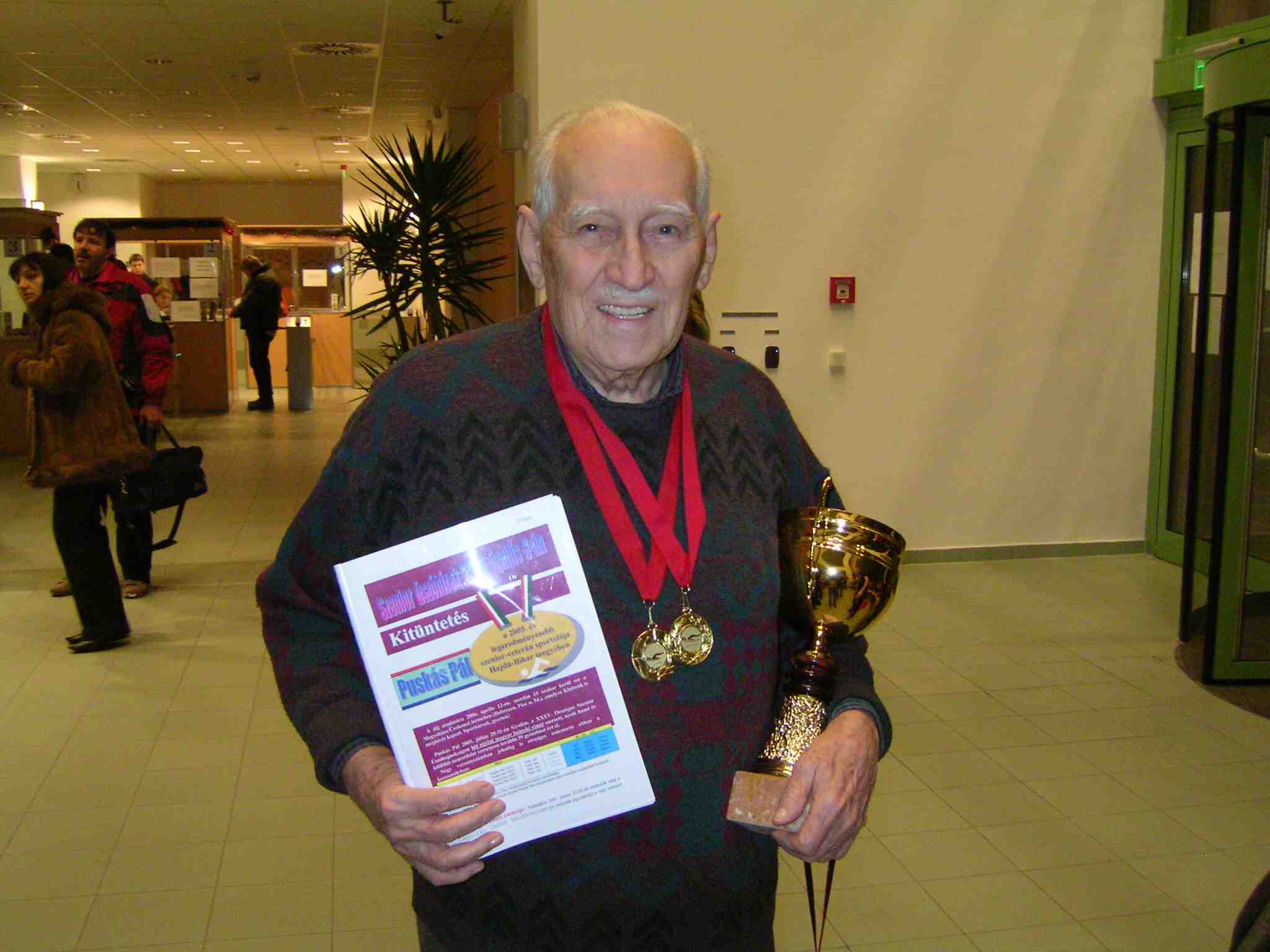 A Debreceni Sportuszoda előterében az idei utolsó közös edzésünk előtt megköszöntöttük a meghívásunkra megjelent Puskás Pált, aki december 23-án ünnepelte 85. születésnapját. ![]() Pali bácsit – többek között Klubunk jelölése alapján – idén áprilisban Hajdú-Bihar megye legeredményesebb szenior-veterán sportolójának választották, kitüntetéséről a 137/2006. sz. levélben számoltam be. Tavaly négy, azóta is fennálló országos csúccsal zárta előző korcsoportját. Idén, a számámára szerencsésnek bizonyult 13. korcsoportban már februári első versenyén, Nyíregyházán három országos csúcsot döntött legidősebb versenyzőnk, amelyet az év végéig tízre növelt. Jelenleg valamennyi medencei gyorsúszó számban (50 m-en, 100 m-en, 200 m-en, 400 m-en és 800 m-en) ő tartja korosztálya országos csúcsát, sőt a Magyar Marathon Klub nem hivatalos 1200 méteres és 2000 m-es versenytávjain is ranglistavezető korcsoportjában. Ez utóbbi két országos „postaverseny*” érmeit is ezen az eseményen akasztottuk Pali bácsi és több megjelent érintett sporttársunk nyakába. Dr. Bohátka Sándor a DEAC egykori versenyzője, Karácsonyi György, Torkos Sándor, Dr. Kádasi Tibor, Dr. Kövér Katalin, Dr. Boros Izabella, és a korábbi edzéseken illetve a hódmezővásárhelyi eredeti díjkiosztón érmüket átvett Dr. Mechler Andrea, Dr. Káldi Ildikó, Dr. Soltész István, Dr. Fábián Ákos és Dr. Rentka László látható még a csapatképen. ![]() A köszöntésekről és éremátadásokról a fotók nagy részét Salamon Tibor készítette, a teljes képsorozat, valamint Puskás Pál, Torkos Sándor és Karácsonyi Emese fotói előbb-utóbb honlapunkra kerülnek (www.magyar.sport.hu/uszas Debreceni Szenior Úszóklub új honlapja Képek Vas András képgalériája). Tisztelt Sportbarátaim! Köszönöm az idei munkátokat, találkozunk 2007. január 3-án, szerdán 18.20-kor újévi első edzésünkön a Debreceni Sportuszodában! Debrecen, 2006. december 29. 23.10 Dr. Rentka László |