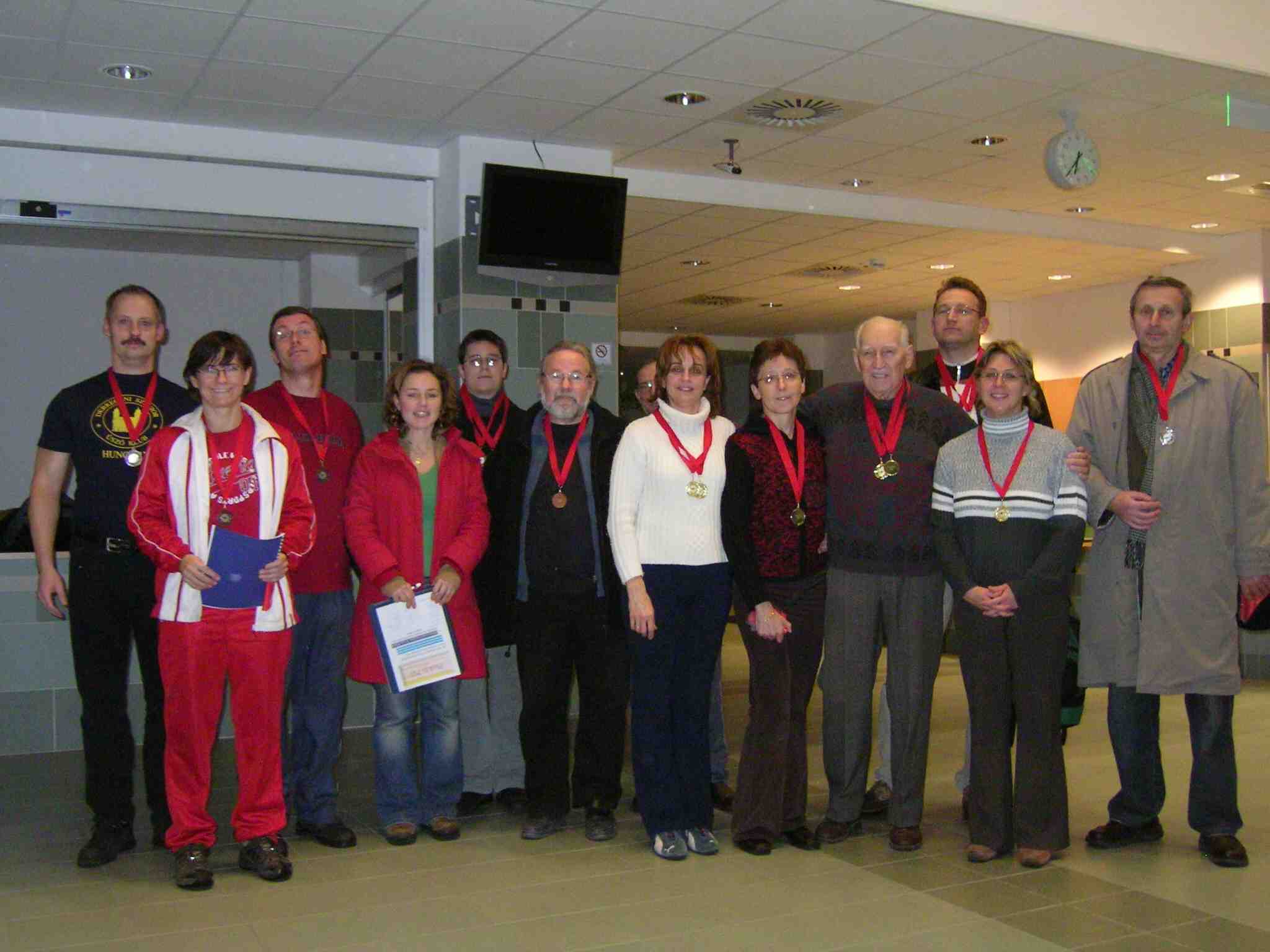 A Debreceni Sportuszoda előterében az idei utolsó közös edzésünk előtt megköszöntöttük a meghívásunkra megjelent Puskás Pált, aki december 23-án ünnepelte 85. születésnapját. ![]() Pali bácsit – többek között Klubunk jelölése alapján – idén áprilisban Hajdú-Bihar megye legeredményesebb szenior-veterán sportolójának választották, kitüntetéséről a 137/2006. sz. levélben számoltam be. Tavaly négy, azóta is fennálló országos csúccsal zárta előző korcsoportját. Idén, a számámára szerencsésnek bizonyult 13. korcsoportban már februári első versenyén, Nyíregyházán három országos csúcsot döntött legidősebb versenyzőnk, amelyet az év végéig tízre növelt. Jelenleg valamennyi medencei gyorsúszó számban (50 m-en, 100 m-en, 200 m-en, 400 m-en és 800 m-en) ő tartja korosztálya országos csúcsát, sőt a Magyar Marathon Klub nem hivatalos 1200 méteres és 2000 m-es versenytávjain is ranglistavezető korcsoportjában. Ez utóbbi két országos „postaverseny*” érmeit is ezen az eseményen akasztottuk Pali bácsi és több megjelent érintett sporttársunk nyakába. Dr. Bohátka Sándor a DEAC egykori versenyzője, Karácsonyi György, Torkos Sándor, Dr. Kádasi Tibor, Dr. Kövér Katalin, Dr. Boros Izabella, és a korábbi edzéseken illetve a hódmezővásárhelyi eredeti díjkiosztón érmüket átvett Dr. Mechler Andrea, Dr. Káldi Ildikó, Dr. Soltész István, Dr. Fábián Ákos és Dr. Rentka László látható még a csapatképen. ![]() A köszöntésekről és éremátadásokról a fotók nagy részét Salamon Tibor készítette, a teljes képsorozat, valamint Puskás Pál, Torkos Sándor és Karácsonyi Emese fotói előbb-utóbb honlapunkra kerülnek (www.magyar.sport.hu/uszas Debreceni Szenior Úszóklub új honlapja Képek Vas András képgalériája). Tisztelt Sportbarátaim! Köszönöm az idei munkátokat, találkozunk 2007. január 3-án, szerdán 18.20-kor újévi első edzésünkön a Debreceni Sportuszodában! Debrecen, 2006. december 29. 23.10 Dr. Rentka László |