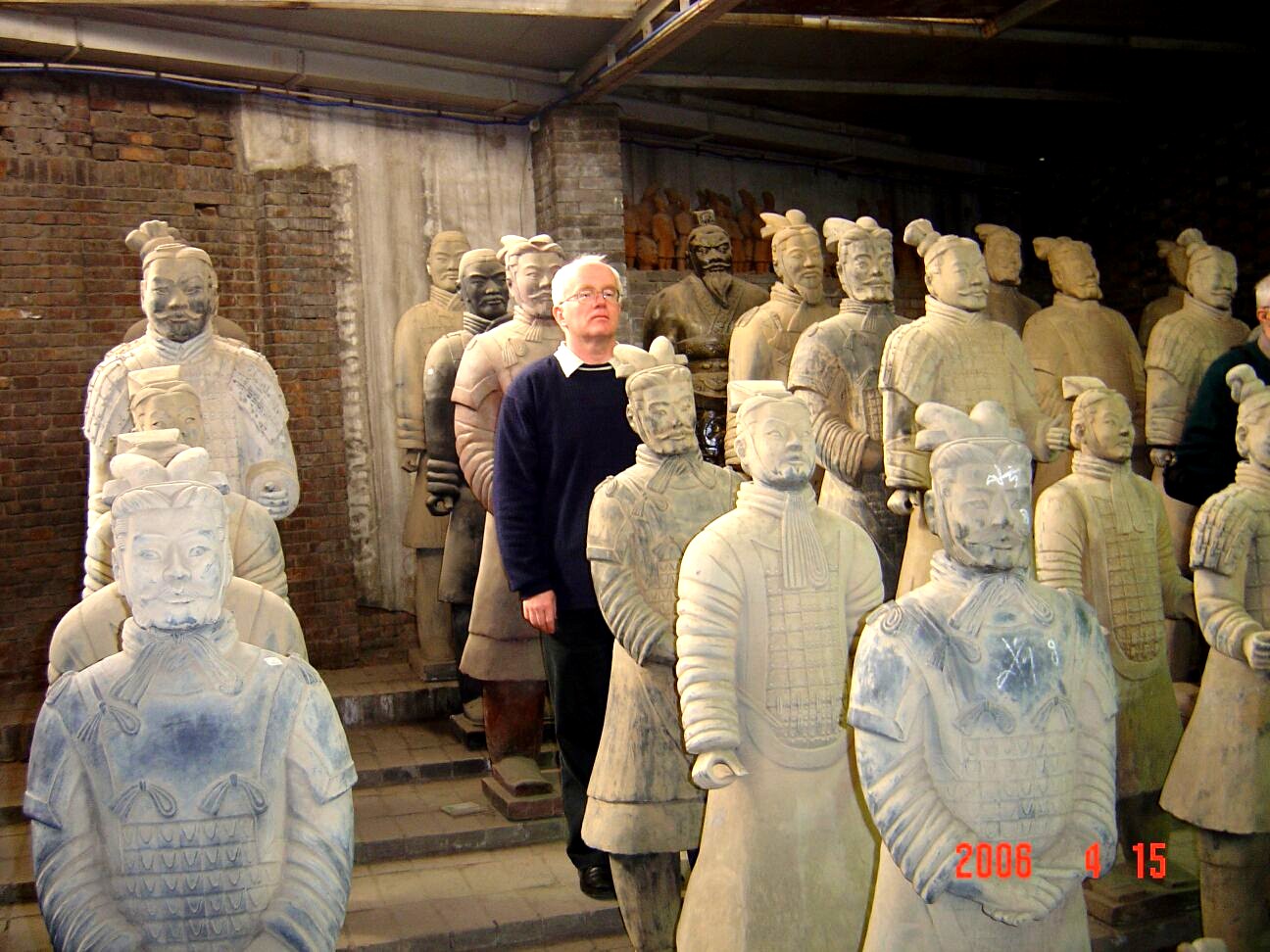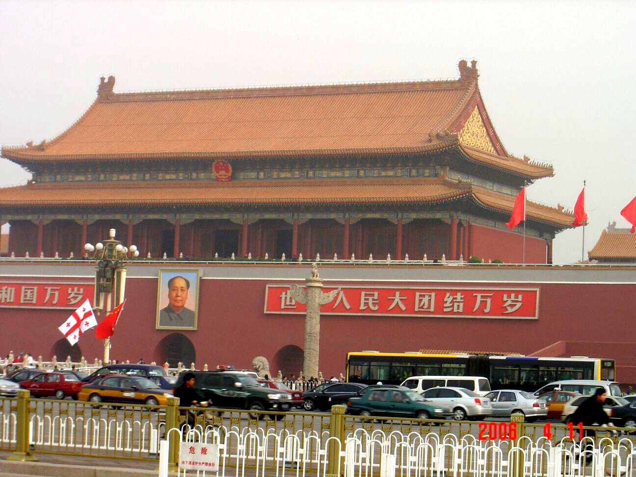 Landolás után nem sokkal, április 11.-én reggel a híres-hírhedt Tian Anmen téren, a Mennyei Béke terén kezdtünk ismerkedni a méretekkel és a tömegekkel. Természetesen ez a világ legnagyobb tere, és az ország politikai közepe. Népi Hősök emlékműve, Mao Cetung mauzóleum, Történelmi múzeum, Forradalom múzeum. Az országos Népi Gyűlés csak ritkán ülésezik, miként a császárok is évente csak kétszer imádkoztak annak idején hosszasabban: év elején a jó termésért és az ellenség elkerüléséért, év végén pedig hálát adtak. Kínát kínaiul nem Kínának hívják, hanem közép-országnak, Magyarország pedig „Sunja Li”-ként ejtendő. Csak azt a néhány kínai szót vagyunk képesek megjegyezni, ami hasonlít egy magyarra. „Szia-szia” – ez körülbelül a köszönöm; az árusok elhessegetésére pedig alkalmas lehet a „pu-ja”, vagyis „nem kell”. A nagyvárosokban a közlekedési tájékoztatásokon a kandzsik alatt szerepel az angolos, latin betűs átírás is - két év múlva olimpia lesz Pekingben. A világ hamarosan rácsodálkozik majd Kínára. Még aznap meglátogattuk a „Tiltott Várost” is, a császárok egykori lakhelyét. Nem lepődünk meg igazán amikor megtudjuk, hogy ez a világ legnagyobb épen maradt palotaegyüttese: 800 épület és 9999 plusz egy fél szoba. Elég felhős, kellemetlen időben barangoltunk a „Tiltott Város” területén. Már készülődött a Gobi sivatag felől a homokvihar, hogy lecsapjon a metropolisra.