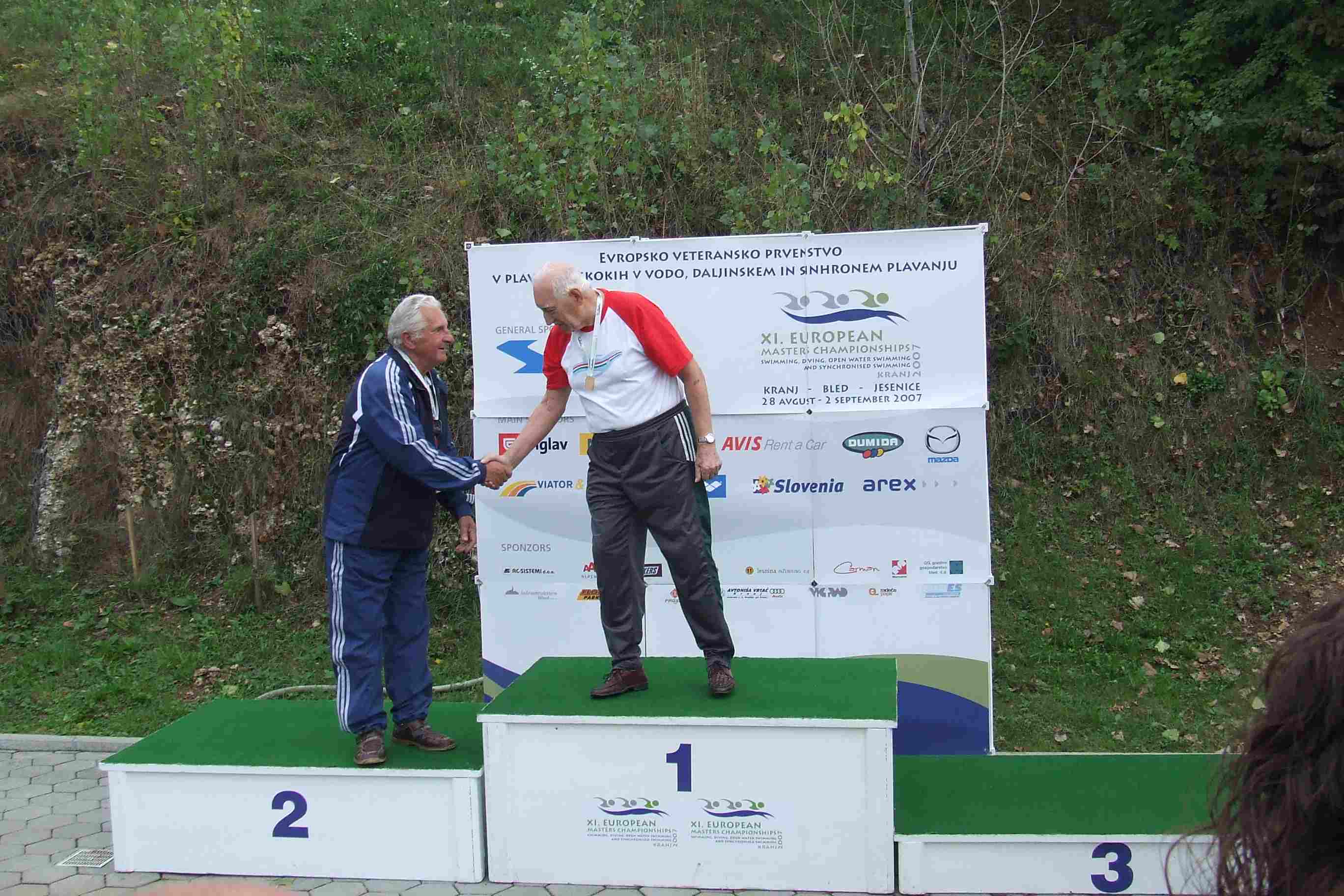 A Debreceni Szenior Úszó Klub hat fős csapattal vett részt a szlovéniai Kranjban augusztus 28 – szeptember 2. között megrendezett XI. Szenior Úszó Európa-bajnokságon. 32 ország 3800 versenyzője nevezett a versenyre. Az első világversenyén szereplő 86 éves Puskás Pál négy egyéni versenyszámban indult, és valamennyiben győzött! Legjobban a 100 méteres gyorsúszásban kellett megküzdenie a győzelemért Pali bácsinak, de itt is közel 5 mp-es különbséggel előzte meg lengyel ellenfelét. A „mesternégyes” nem előzmények nélkül született: Puskás Pál az 1930-as, 40-es években aktív úszóversenyző volt, majd a 70-es évektől a gyulai szenior országos bajnokság győztesei között találkozhatunk a nevével. Több éves kihagyás, betegség, majd sikeres szívműtét után kezdte újra az úszást és a szenior versenyzést az időközben megalakult Debreceni Szenior Úszó Klub színeiben. Számos hazai és külföldi versenyre eljutott, és gyorsúszásban évek óta nem talált legyőzőre. Előző korcsoportjában négy, a jelenlegiben mind a hat gyorsúszó versenyszámban ő tartja az országos csúcsot 50 m-től 1500 méterig, sőt a nem hivatalos 1200 m-es és 2000 m-es táv országos ranglistáját is ő vezeti. A tavalyi szenior világbajnokság kategória győztes eredményeinél Puskás Pál négy gyorsúszó távon jobb időeredményeket ért el a hazai és külföldi versenyeken, így jó eséllyel nevezett az idei Európa-bajnokságra. Az előzetesen nyilvánosságra hozott rajtlisták tovább erősítették várakozásainkat. Pali bácsi unokája, Puskás Levente társaságában utazott a versenyre. A lelátón lévő nagy tömeget, az esős időjárást, a hosszú, több órás várakozásokat, a zsúfolt melegítési lehetőségeket jól viselte az idős debreceni versenyző. Fegyelmezett, okos versenyzéssel valamennyi versenyszámában sikerült győznie. A közel 200 fős magyar küldöttség tagjain kívül számos külföldi sporttársa gratulációját fogadta Pali bácsi.