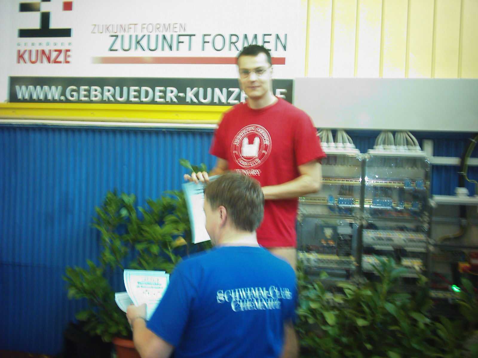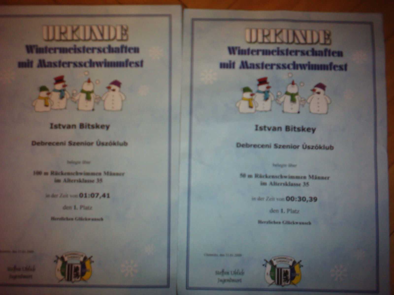 2009. jan.31-feb. 1-én immáron harmadik alkalommal rendezték meg Chemnitz-ben a Téli Úszóversenyt. Nagyon tetszett a tavalyi, a jó medence, a hangulat, és a profi szervezés miatt, ezért úgy döntöttem, hogy ez évben is elindulok. Csütörtök este már Rajkán aludtam, majd pénteken még hét órás vezetés várt rám a Pozsony-Brno-Prága-Drezda-Chemnitz útvonalon. Egy 30 kilométeres szakasztól eltekintve végig autópályán lehetett haladni, bár voltak hegyes-havas szakaszok útközben. A versenyen 20 német klub, elsősorban fiatal versenyzői álltak rajthoz, de szeniorok is indulhattak, és a szokásos, korosztályos értékelés szerint történt az eredményhirdetés. 10-15 szenior versenyző volt összesen, így a legtöbb szenior korcsoportban nem indult senki ill. max. 1-2 versenyző. Engem is elsősorban az időeredmény motivált. Az uszoda egy sportcentrumban volt, az uszoda mellett több kisebb-nagyobb sportcsarnok is van, valamint egy hatalmas futball stadion. Az egyik nagy sportcsarnokban épp egy atlétikai verseny volt, ahol az úszóversenyhez hasonlóan, szintén elindultak szeniorok a fiatalok mellett. Az úszóverseny nyolc pályás, 50-es medencében volt, a hangulat nagyon barátságos, többen érdeklődtek a debreceni szenior és nem szenior úszóéletről. Én egyik nap 50, másik nap 100 háton úsztam, 0:30,39 ill. 1:07,41 -et, ezzel a 3. korcsoportban (35-39 év) sikerült új országos csúcsot elérnem. A verseny nagyon jól szervezett volt, nagyon gyorsan lezajlott, ha beért egy futam, nem várták meg míg kiszállnak a versenyzők a vízből, hanem máris következett a következő futam. Az eredményhirdetések is folyamatosak voltak a verseny alatt, amíg egy lány versenyszám ment addig fiú eredményhirdetések és fordítva. Az egyes versenyszámok után az eredmények azonnal az interneten is elérhetőek voltak. Hosszú, fárasztó út volt visszafele, vasárnap késő este érkeztem haza, de az élmény és az eredmény miatt mindenképp megérte újra résztvenni. ifj. Bitskey István